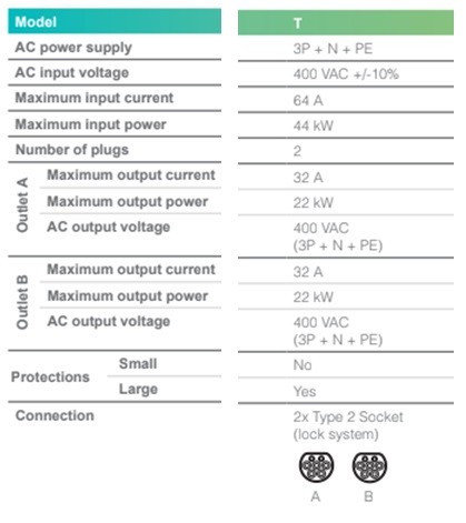 El punto de recarga eléctrica tiene una intensidad máxima de 32A y una potencia suministrada máxima de hasta 22 kW, por lo que se clasifica como un punto de recarga semi-rápida (tipo 2).