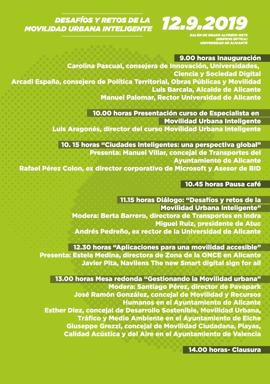 Desde PAVAPARK comprometidos con la gestión integral de la movilidad sostenible y eficiente, la  integración de personas con diversidad funcional, y el desarrollo de soluciones Smart City dirigidas a ciudadanos y administración pública, celebraremos un año más, el pasado día 12 de septiembre en la Universidad de Alicante (UA), junto con un excelente grupo de socios, colaboradores y ponentes, una interesante jornada en la que tratamos de aportar entre todos nuestro granito de arena a los «Desafíos y retos de la Movilidad Urbana Inteligente»